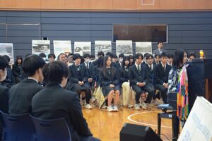 10月29日(水)本校第一体育館において、被爆ピアノ管理所有者・調律師の矢川光則さん、シンガーソングライターの南壽あさ子さん、被爆ピアノ平和コンサートin YAMAGATA実行委員長の菅野徳明さんをお招きし、「2025被爆ピアノ平和コンサート in YAMAGATA」を行いました。