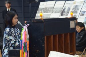 映画「おかあさんの被爆ピアノ」の主題歌「時の環(南壽あさ子さん作詞、作曲)」や、松田聖子さんの「瑠璃色の地球」など5曲を披露していただきました。ピアノの美しい旋律と、南壽さんの透明感あふれる声が響くと会場の空気が澄み渡り、静かに心の奥に染み込んでいくように感じました。誰もが息をするのを忘れ、その唄声に聞き入っていました。