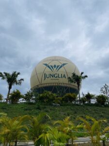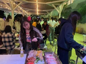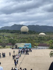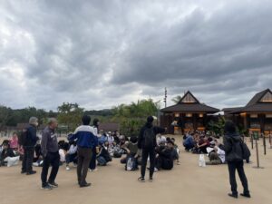 曇り空ではありますが、ちょうどよい気候で、アトラクション待ちもへっちゃら。生徒たちは楽しんでいます。