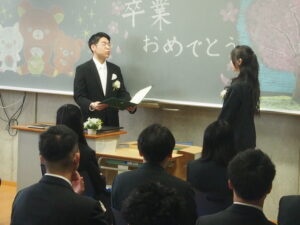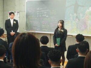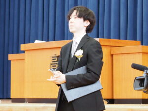 在校生代表の石沢一葉さんによる送辞に対しての、卒業生代表の鈴木楓馬さんの答辞では、保護者、仲間、恩師、在校生に対する感謝の念を述べ、これから待ち受けている人生の荒波に、ここで培った人間性で立ち向かうことを誓いました。