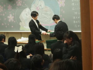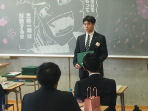 式終了後の最後のホームルームでは、担任より一人一人に卒業証書が手渡され、三年間の思い出のスピーチで笑ったり、泣いたりと様々な感情が交差し別れを惜しむ雰囲気となりました。