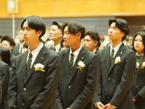 在校生代表の石沢一葉さんによる送辞に対しての、卒業生代表の鈴木楓馬さんの答辞では、保護者、仲間、恩師、在校生に対する感謝の念を述べ、これから待ち受けている人生の荒波に、ここで培った人間性で立ち向かうことを誓いました。