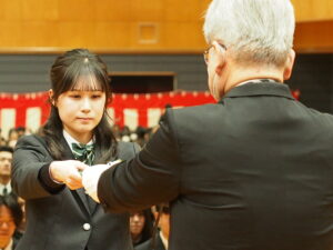 石澤惣栄校長による式辞では、経済産業省が提唱した「職場や地域社会で多様な人々と仕事をしていくために必要な基礎的な力=社会人基礎力」を例に挙げ、「前に踏み出す力」「考え抜く力」「チームで働く力」の三つの力をこの三年間で身に着けた卒業生を称えました。