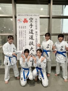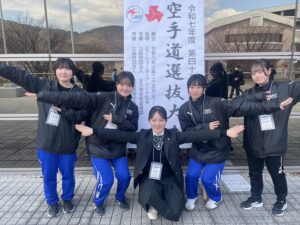 女子団体組手5人制(佐々木蘭さん 青木朱莉さん 渡辺理緒さん 金田来海さん 平吹春子さん)に出場し、1回戦はシード、2回戦で敗退という結果になりました。思うような結果を得られず、全国の壁の高さを痛感しましたが、選手全員がのびのびと試合が出来たこと、2026年度のインターハイ出場に向けて大舞台を経験できたことが大きな収穫となりました。